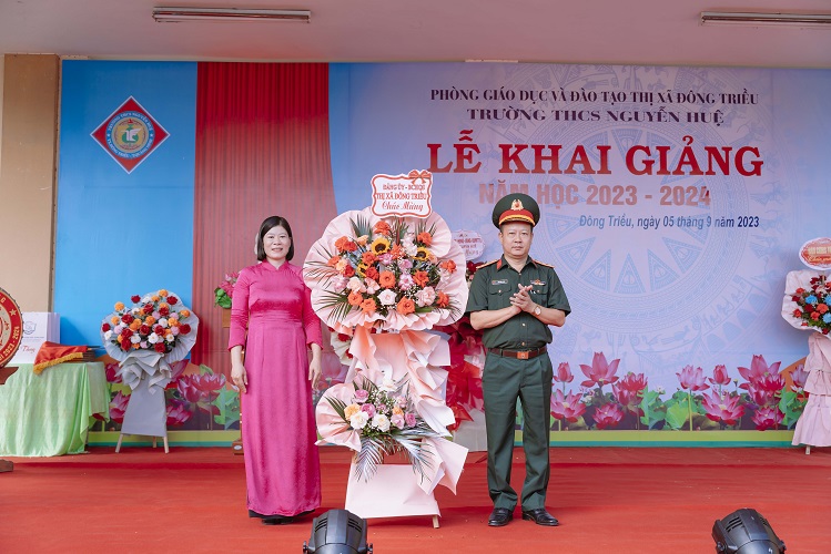 Về dự Lễ khai giảng, về phía đại biểu lãnh đạo Đảng ủy-Ban chỉ huy Quân sự thị xã Đông Triều có đồng chí Lưu Đình Toàn - chính trị viên phó Ban chỉ huy quân sự thị xã Đông Triều. Về phía lãnh đạo địa phương có đồng chí Nguyễn Văn Nhu - Bí thư Đảng ủy - Chủ tịch UBND xã Nguyễn Huệ. Đại diện Ban CMHS có bà Nguyễn Thị Dung - Trưởng ban đại diện CMHS nhà trường. Cùng các đồng chí là trưởng các ban ngành, đoàn thể đại diện cho Ban chỉ huy quan sự xã, đoàn thanh niên xã, Trạm y tế xã, Công an xã, các đồng chí là Bí thư - trưởng các thôn trên địa bàn xã Nguyễn Huệ.