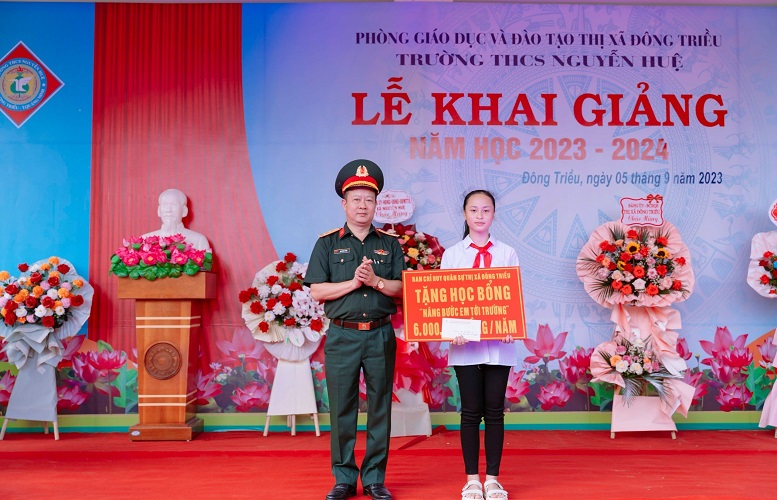 Cũng tại buổi Lễ đ/c Lưu Đình Toàn –  Chính trị viên phó –  Ban chỉ huy quân sự Thị xã; đã trao 01 suất học bổng 6000.000 đồng cho em Trần Khánh Linh học sinh lớp 9B (học sinh học giỏi vượt khó). Ngoài ra hội chữ thập đỏ của xã Nguyễn Huệ, hội khuyến học nhà trường cũng có những phần quà dành tặng 09 học sinh có hoàn cảnh khó khăn trong nhà trường nhằm động viên, khích lệ, tạo điều kiện giúp các em vui bước đến trường.