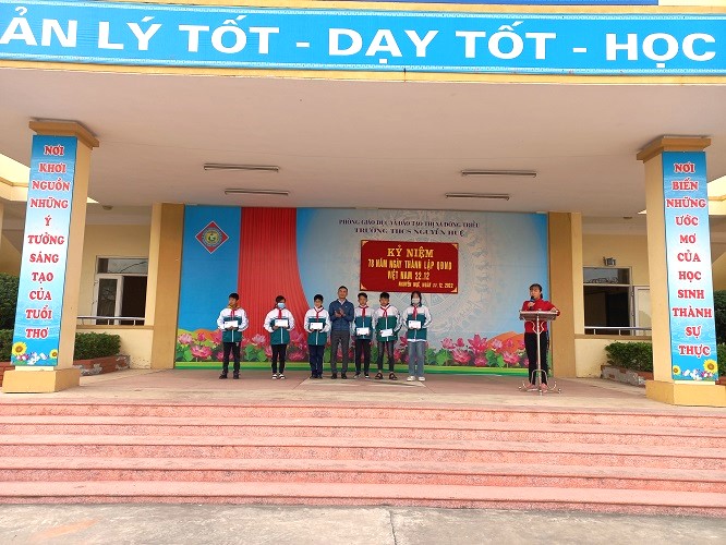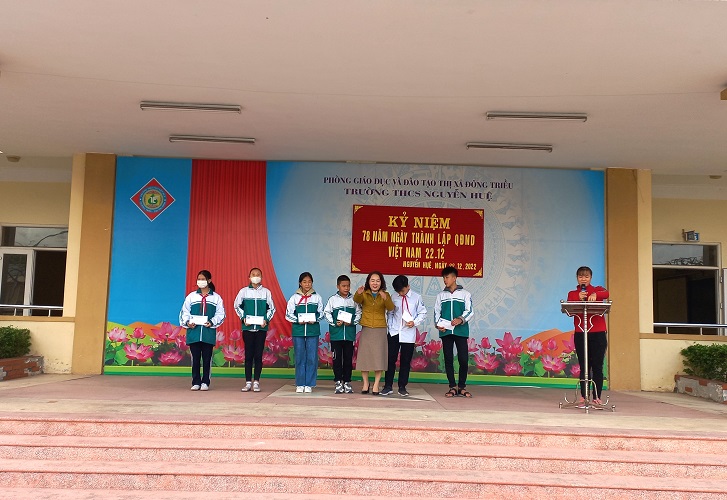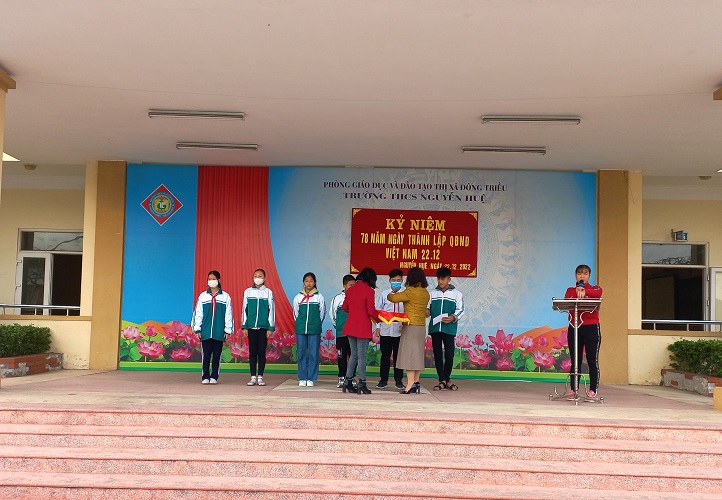 Sáng ngày 26/12/2022, trong buổi sinh hoạt dưới cờ, Liên đội trường THCS Nguyễn Huệ đã tổ chức sơ kết đợt thi đua chào mừng kỷ niệm 78 năm Ngày thành lập Quân đội nhân dân Việt Nam (22/12/1944-22/12/2022); 33 năm Ngày hội Quốc phòng toàn dân (22/12/1989-22/12/2022), trong học sinh toàn trường. Nhà trường đã trao phần thưởng cho các tập thể và cá nhân có thành tích xuất sắc trong đợt thi đua. Giải bóng đá mini và cầu lông học sinh các lớp đã tạo ra môi trường vui chơi lành mạnh, tạo điều kiện cho các bạn học sinh các lớp được giao lưu thi đấu với nhau.